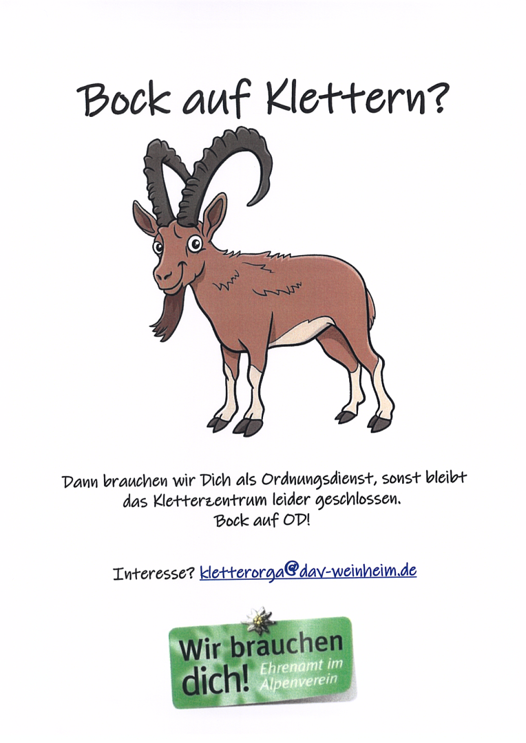 Wenn du außerhalb dieser Zeiten eingearbeitet werden möchtest, melde dich bei Kerstin unter kletterorga@dav-weinheim.de